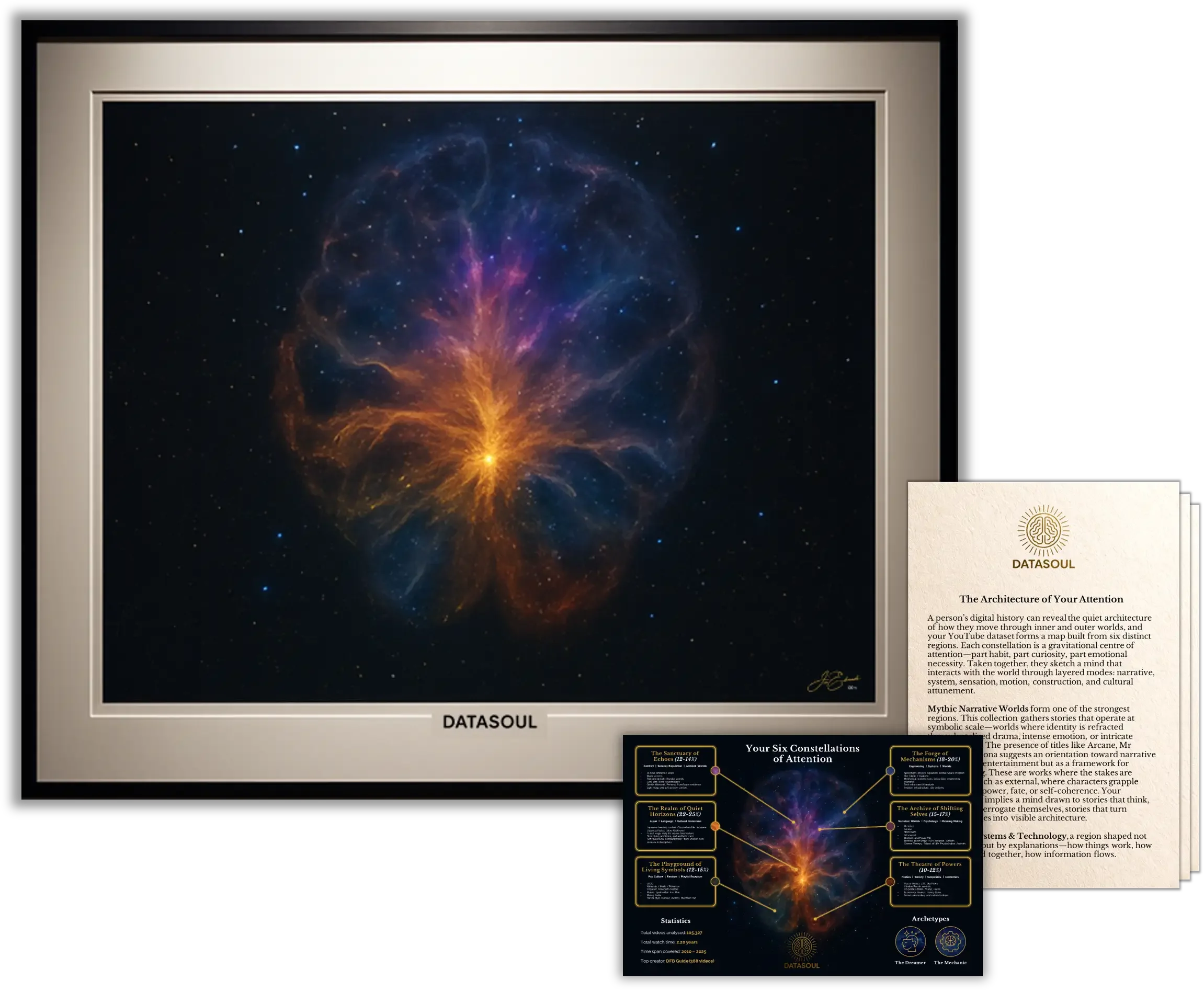 Datasoul’s purpose is simple: to transform the patterns of your attention into something meaningful, beautiful, and deeply personal. Not to replace your creativity, but to reflect it back to you in a new form.